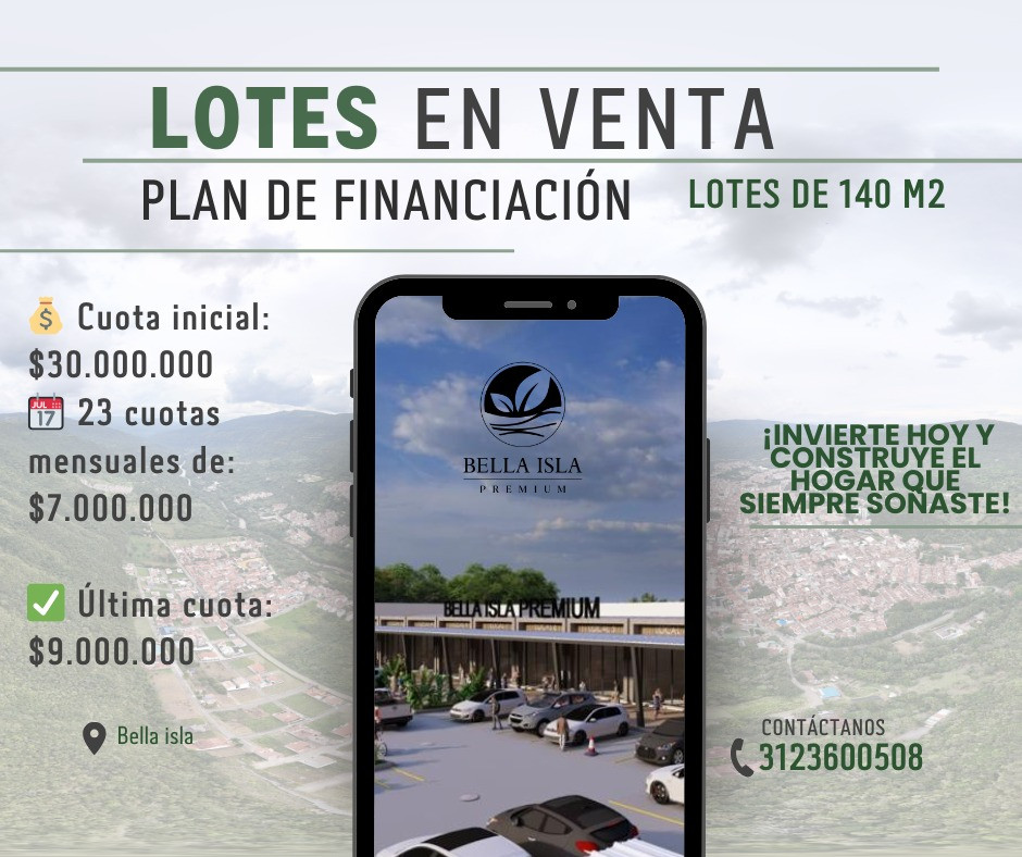 FB INMOBILIARIA SAS Tiene para la venta lotes ubicados en el barrio bella isla, quedaran situados en un nuevo conjunto residencial moderno,se tendra vigilancia privada, parques infantiles, adicional a ellos se esta contruyendo masivamente locale comerciales junto al conjunto ,esta construccion se llamara bella isla premium donde se contruiran casas de 2 niveles y sus lotes quedaran de 140 m2, tenemos modalidades de financiamiento
